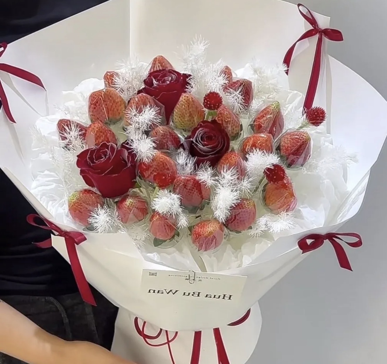 23颗草莓搭配3朵红玫瑰混搭永生蓬莱松花束