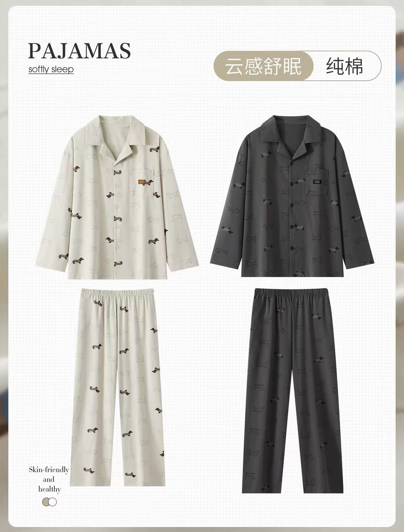 日系可爱卡通腊肠狗小狗情侣睡衣女春秋纯棉长袖全棉休闲男家居服